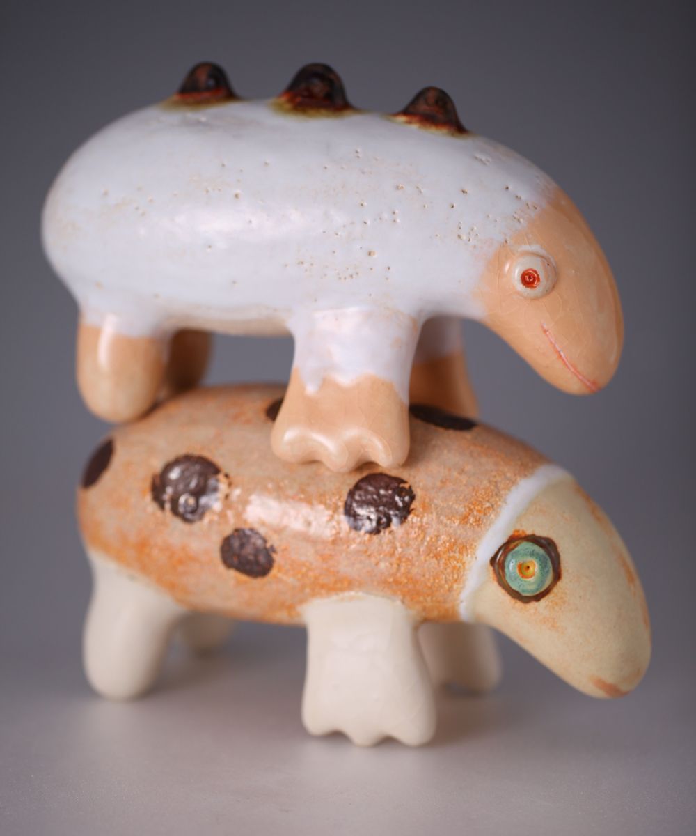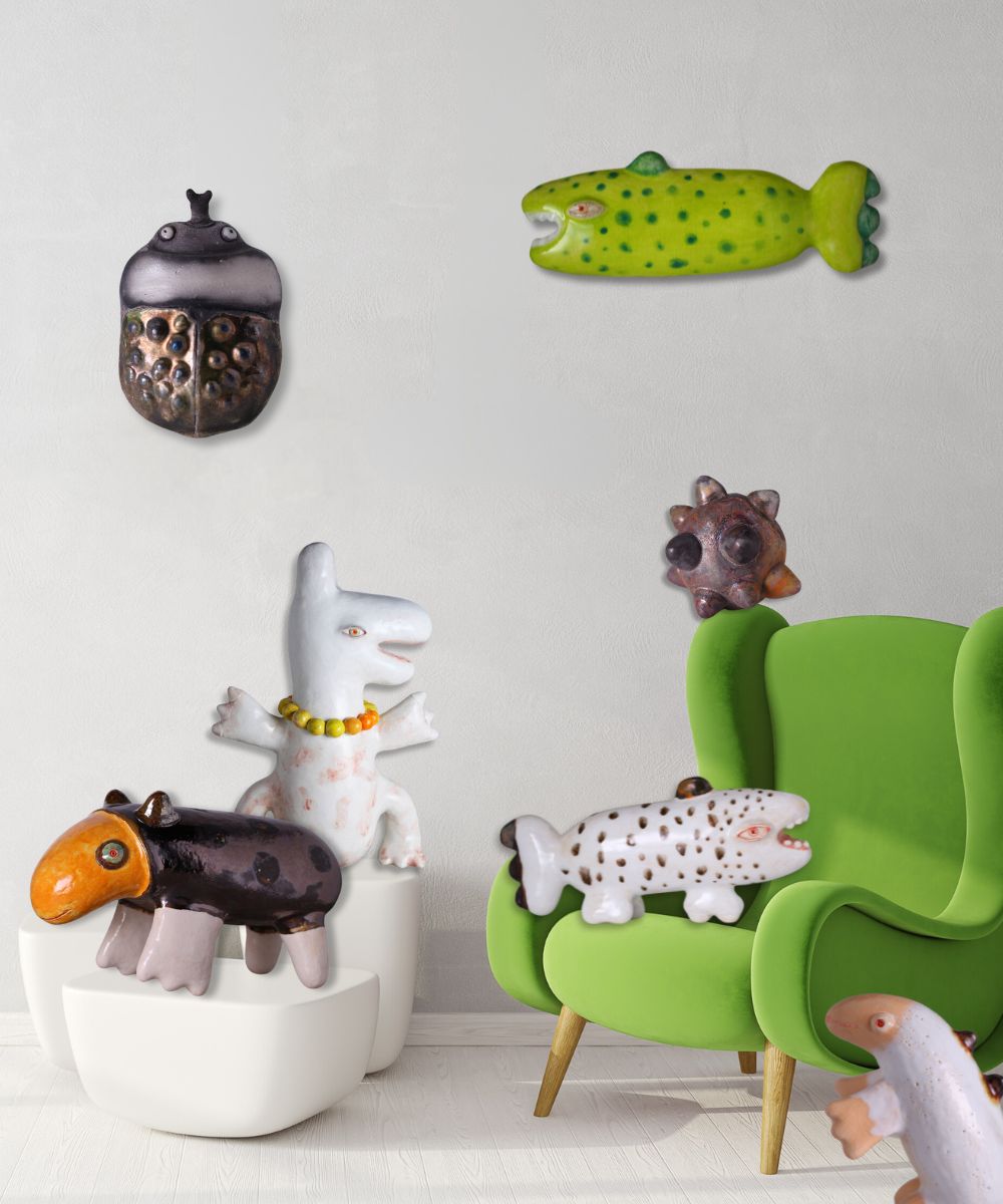 Sculture in ceramica contemporanea fatte a mano: animali e creature misteriose dal fascino primordiale.