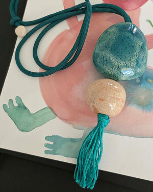 With its turquoise cord and sliding knots, it is extremely comfortable to wear and adapts to any neckline. Choose a long version for a sculptural touch that follows your steps, or a short version to emphasize its organic shape.